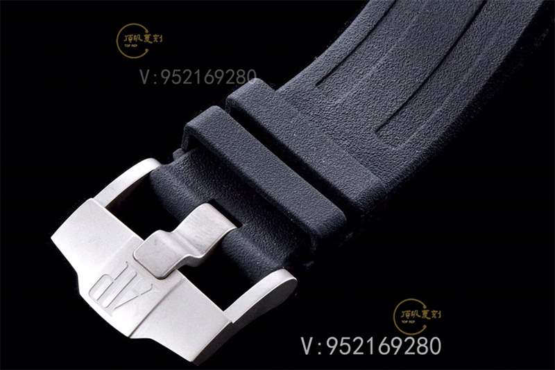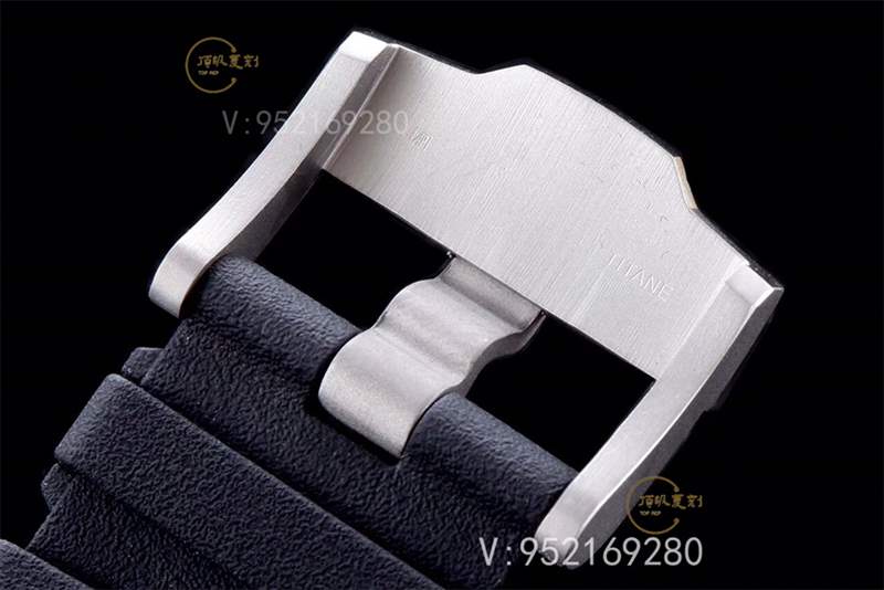 鈦金屬表扣,同樣的經過了精細的拉絲以及倒角處理,針扣嚴絲合縫,表帶為天然橡膠軟膠帶,佩戴舒適。