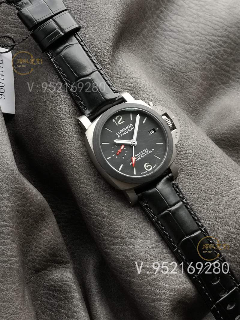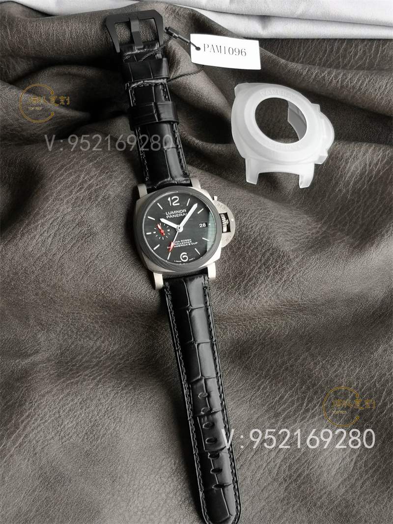 官方介紹:VS廠(SBF廠)限量發行:沛納海廬米諾系列PAM01096腕表,鈦金屬表殼搭配意大利進口小牛皮表帶,Scafotech TM 材料表盤,阿拉伯數字及小時標示以白色Super-LumiNova TM 夜光涂層涂覆,綠色夜光顯示。印有特別制訂的「Luna Rossa Challenger 36th America’s Cup」字樣,搭載P.9010/GMT型自動機芯,42毫米。