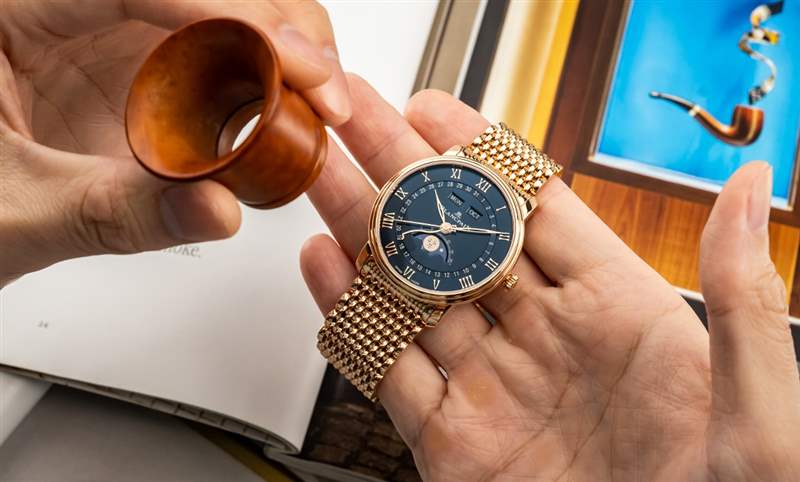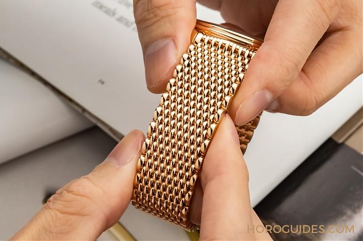 2020年新推出Villeret新作午夜藍面紅金表款,包含有分別搭配上鱷魚皮表帶與米蘭鏈帶的兩種款式。其中,饒富古典雅致氣息的米蘭帶款,由531個獨立配件組成,鏈帶與表殼銜接順暢,鏈帶本身的手感柔滑細致,拋光打磨講究,每個鏈結的邊角與銜接都做了精致的處理,配戴起來舒適貼手。
