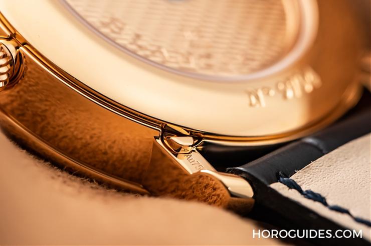 一般來說,復雜功能的調校裝置普遍設置在表殼側面,調校時需搭配一只棒狀調校器來按壓位在表側的微小凹孔,不管價格再高昂的復雜表款,幾乎都是采用這樣的設計。但寶珀不同了,它將調校裝置設在表耳背后,而且是只需以手指按壓即可的設計,無需使用額外工具,這一點需要牽涉到的技術問題無疑繁復了許多,試想,從表耳上的一個小按鈕,就能牽動機芯機組的運作,要克服這兩者間的有效連結,相對使得設計與制作更為繁復困難。但也因為這進一步的貼心設想,大大提升了操作上的方便性,還免除了很可能經常找不到調校棒的困囧。