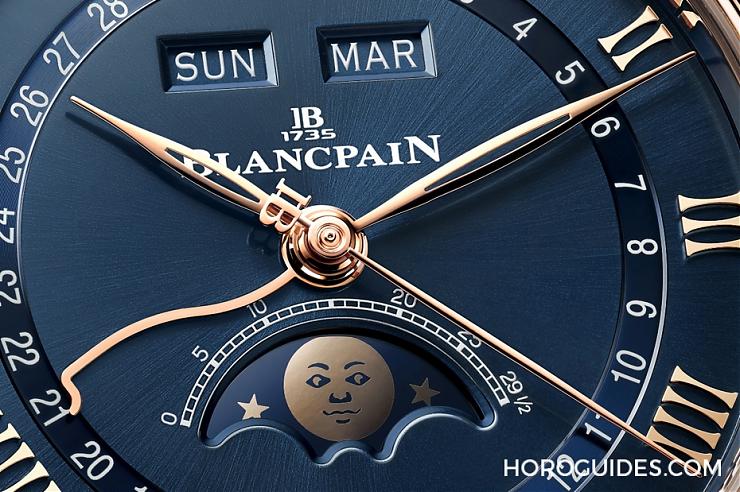 寶珀的月相顯示有著自成一家的特色。月相男表上的月亮,是一張雙眼朝同一邊張望的男性臉孔;月相女表上的月亮,則是閉眼凸顯出長睫毛的女性面孔,而且左頰上還有一顆美人痣,可謂名符其實的月娘。月相顯示窗上緣,標示出29又1/2天的軌道式日期刻度,下緣則是猶如云朵般的大小半圓弧所構成。